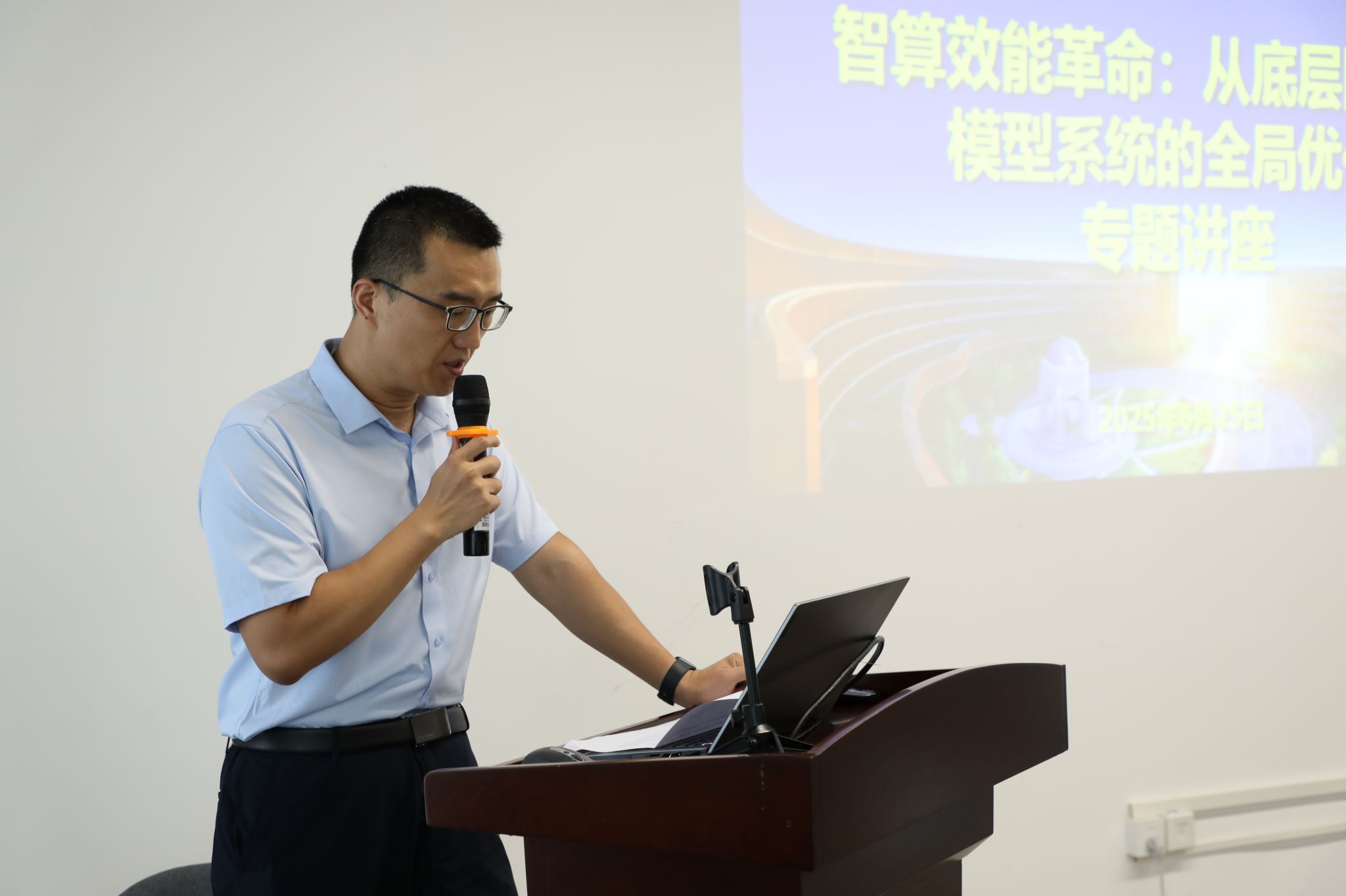 为应对人工智能发展面临的算力效率瓶颈问题,探讨高质量算力技术发展路径,天津大学合肥创新发展研究院(以下简称“天大合肥院”)于6月25日上午成功举办首期天大合肥院大讲堂——“智算效能革命:从底层网络到模型系统的全局优化”专题讲座活动。本次活动由合肥经济技术开发区经济发展局(科学技术局)、投资促进局与天大合肥院联合主办,讲座由天大合肥院综合办主任韩宇主持。