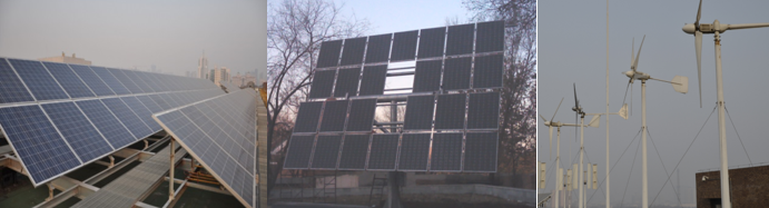 (a) 光伏发电阵列 (b) 太阳跟踪式光伏 (c) 水平轴永磁风机